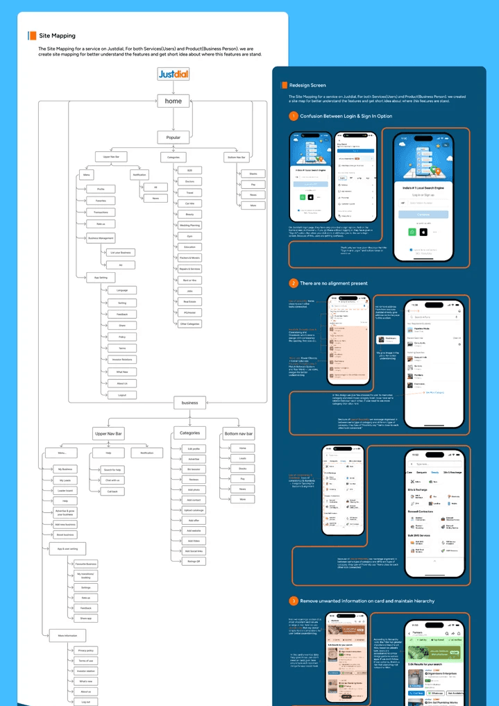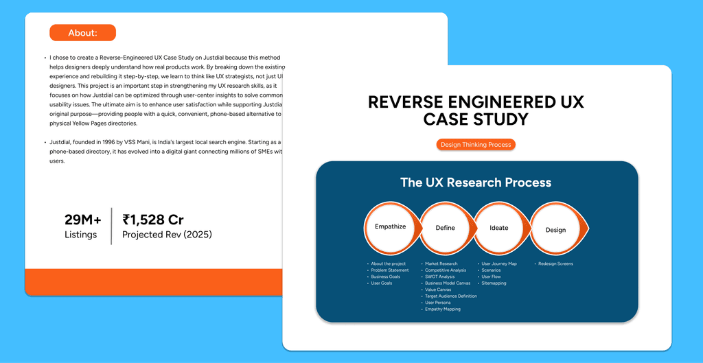I chose to create a Reverse-Engineered UX Case Study on Justdial because this method helps designers deeply understand how real products work. By breaking down the existing experience and rebuilding it step-by-step, we learn to think like UX strategists, not just UI designers. This project is an important step in strengthening my UX research skills, as it focuses on how Justdial can be optimized through user-center insights to solve common usability issues. The ultimate aim is to enhance user satisfaction while supporting Justdial’s original purpose—providing people with a quick, convenient, phone-based alternative to physical Yellow Pages directories.